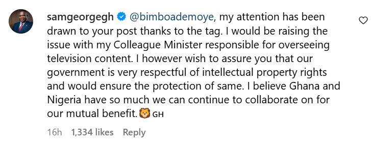 On Sam George’s part, he told the actress he would raise her complaint with his “colleague minister’ while also assuring her that the Ghanaian government is committed to protecting intellectual properties.