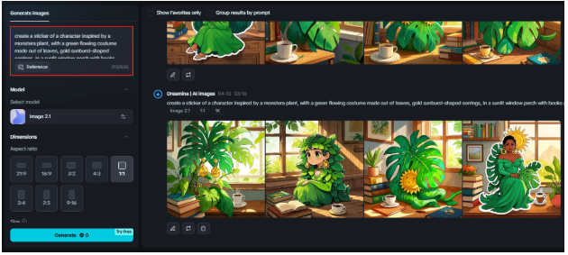 Go into Dreamina's "image generator," where you will start crafting your plantsona. The prompt is everything, really, your verbal compost. Make it detailed and specific so that your leafy character breathes with intention.