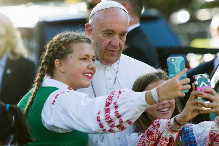 Pope Francis emerged from the Vatican Embassy Wednesday morning to head to the White House, he quickly bent the selfie rules for some very lucky school children waiting outside.
