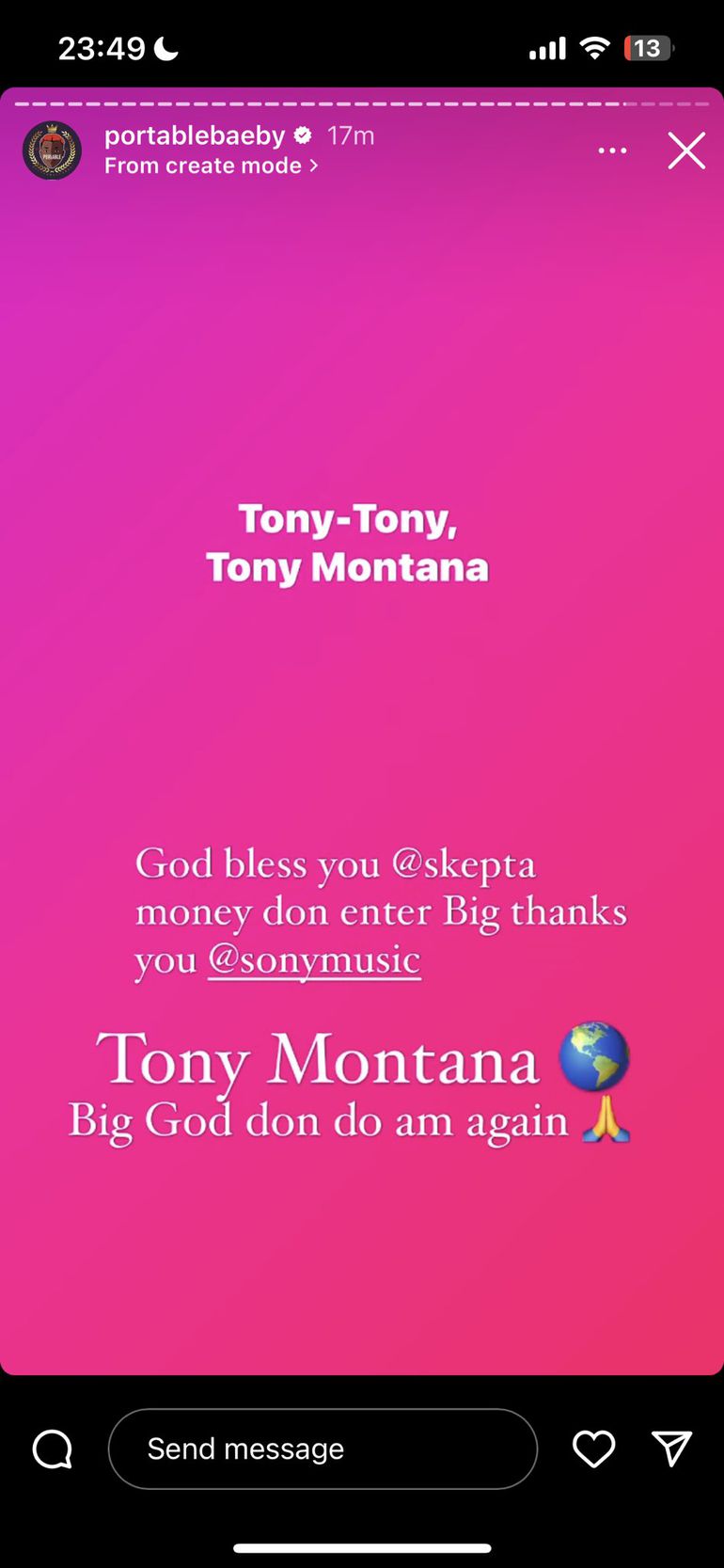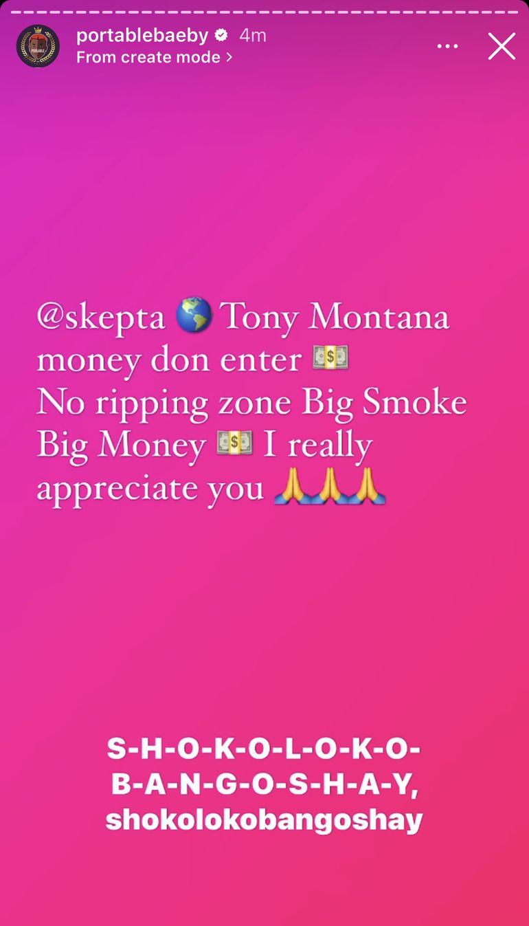 "God bless you @skepta. Money don enter. Big thanks @sonymusic," Portable said in the post.