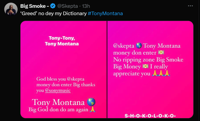 "@skepta Tony Montana money don enter. No ripping zone. Big Smoke, Big Money. I really appreciate you".
