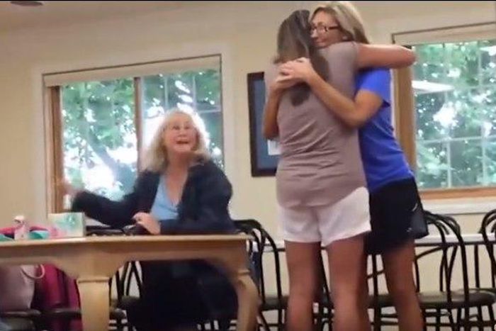 In the video, Beth Battista the teacher, is hugging Dena Carreyn, the mother of 4-year-old Lyla, both from Madison, Wisconsin, USA.