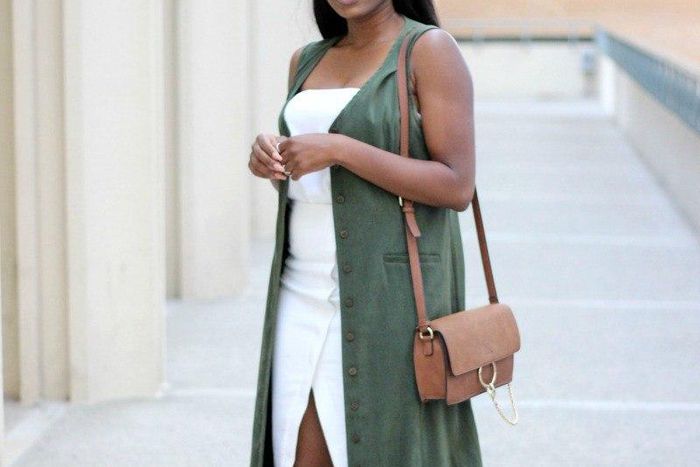 The stylish lady finished off her look with a pair of gorgeous olive sock fit ankle booties, brown leather strap bag, fashion rings and her hair is let down in a side part. She also rocked a pair of cat shades and a minimally made up face