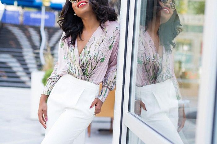 The lifestyle and fashion blogger finished off her look with a pair of animal print pumps, pearl earrings vibrant makeup with bright red lips and her hair is let down. She also rocked a pair of Calvin Klein sunglasses from whichhas a modern feel and the shape and thin metal eye rim add to its beauty.