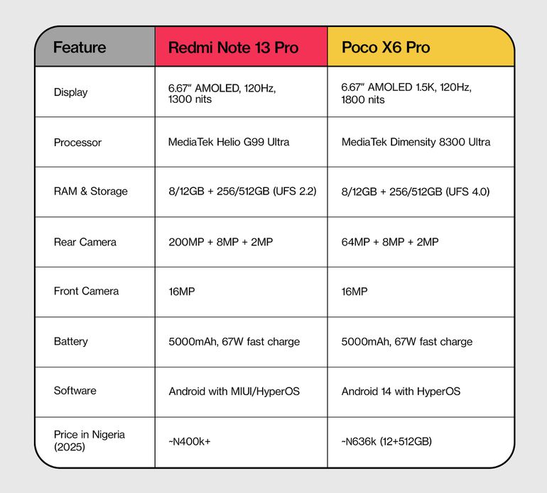 So, between the Redmi Note 13 Pro vs Poco X6 Pro in Nigeria, which should you buy in 2025?