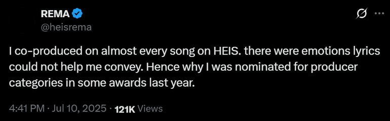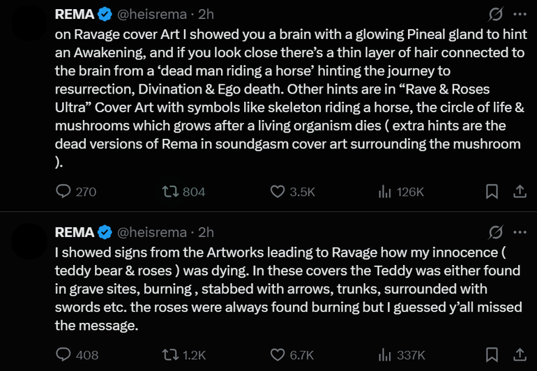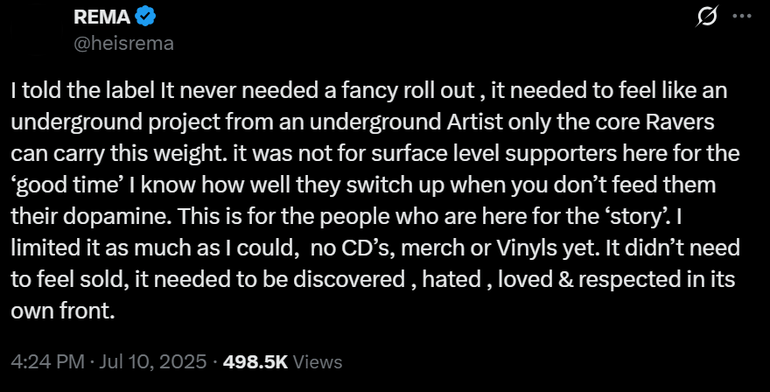 In a series of posts on X, which he tags "Author's Notes," Rema shared that although he highlighted the need to restore Afrobeats to its roots as one of the motivations for his sophomore album, there was more artistic depth to the project than he initially shared.