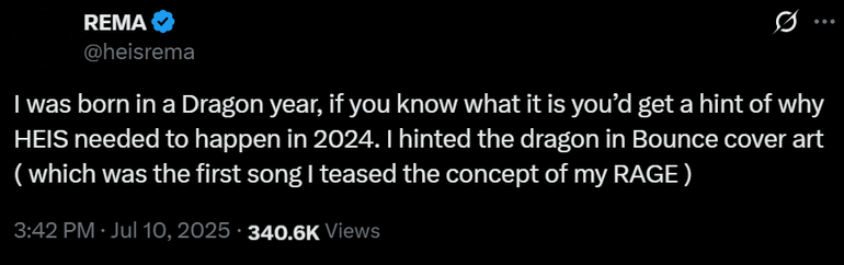 "I was born in a Dragon year, if you know what it is, you’d get a hint of why HEIS needed to happen in 2024. I hinted the dragon in Bounce cover art (which was the first song I teased the concept of my RAGE)".