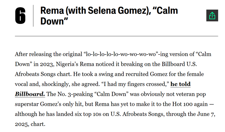 The Billboard chart is based solely on commercial impact in America. It takes either a viral global moment that impact that American media space or some elaborate and strategic amplification on US radio for African stars like Rema to make the Hot 100. Both are moments that are few and far between.