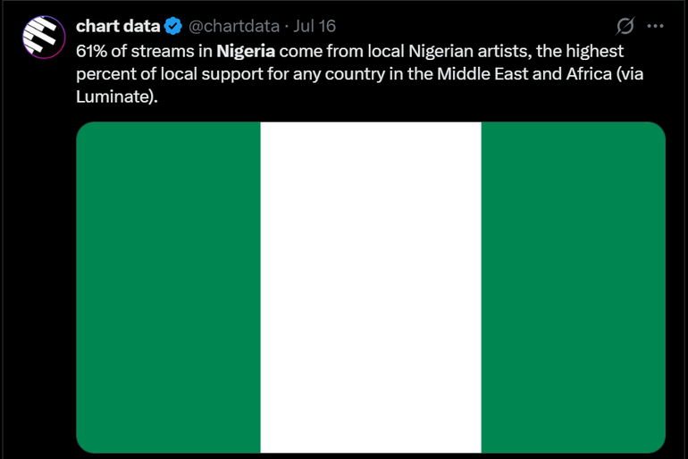 A report by Luminate shows that 60% of the streams coming from Nigeria goes to Nigerian artists and songs. This is more than any other country in Africa and the Middle East.