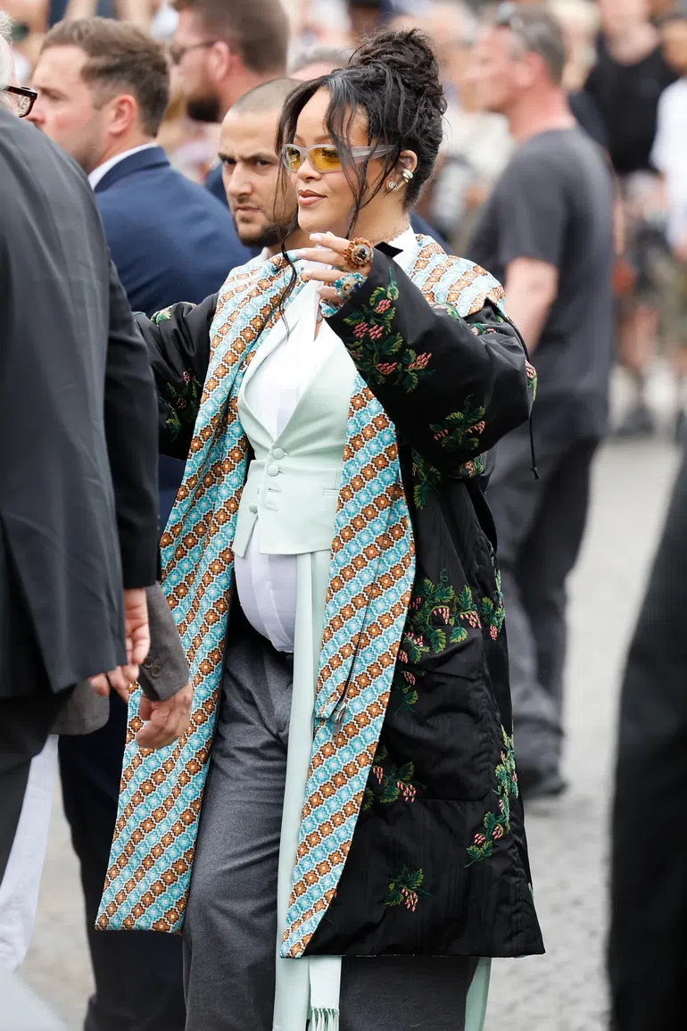 Only Rihanna could blend streetwear with Victorian drama and make it a moment. For Paris Fashion Week, she wore a quilted floral-embroidered coat lined with a geometric print over a mint green cropped waistcoat and white top.