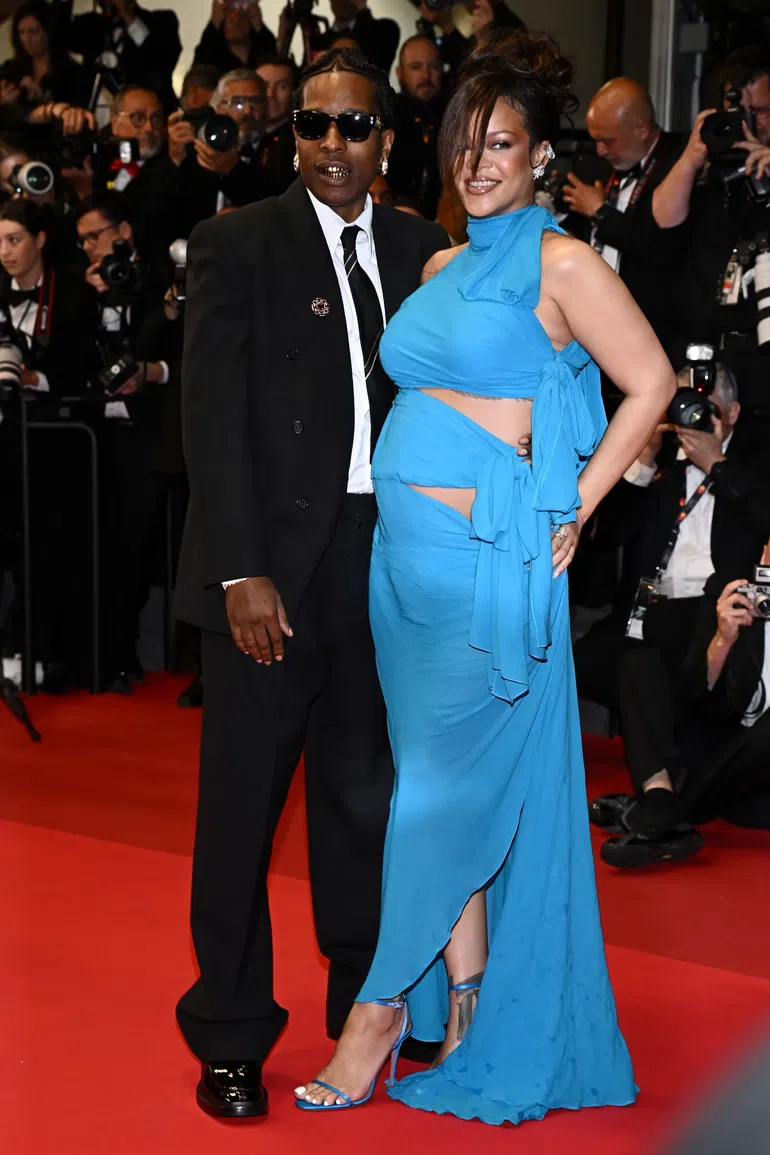 Rihanna electrified the French Riviera in an eye-watering blue gown at Cannes, adorned with cut-outs and bow-tied drapings of generous proportions around her middle. Asymmetrical to highlight her bump beautifully, it was the focal point of the look.