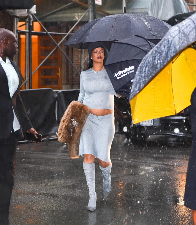 Who else would turn a rainstorm into a full-on style moment? Rihanna arrived in a ribbed grey knit co-ord with a long-sleeve crop top and asymmetrical skirt, all putting her baby bump in the spotlight.