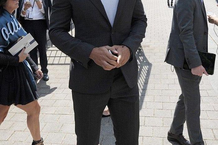 The former Manchester United looked dapper in a charcoal tailored suit which he paired with a short straight-cut suit trousers with trainers.
