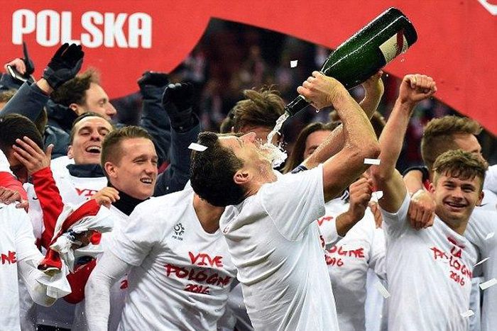 The 27-year-old was pictured drinking from a celebratory bottle following Poland’s crucial 2-1 victory over Ireland at Warsaw's National Stadium which saw them through to next year’s finals in France.