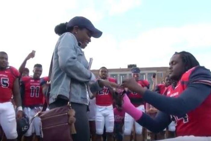 Just last Saturday, October 15, 2016, Deion Pierre who plays for Samford University in Alabama popped the question to girlfriend, Jasmine Henderson in a manner so good that it has now gotten our attention on this side of the map.