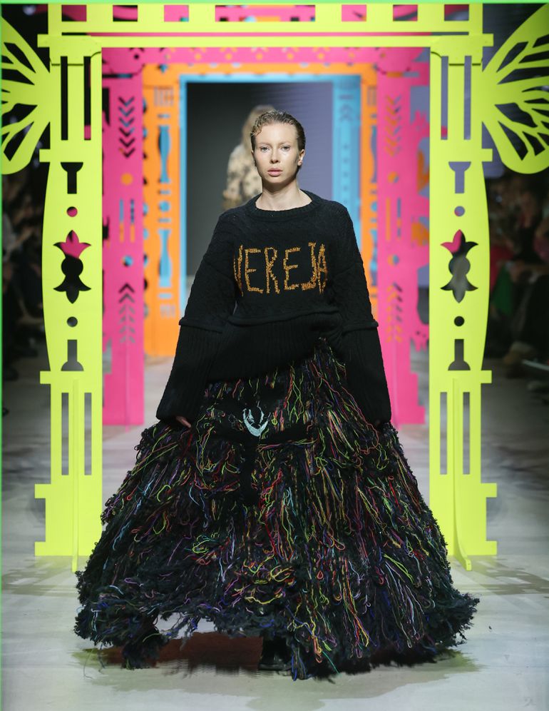 Vereja, a brand celebrated for its reimagination of Russian folklore, returned to Moscow Fashion Week with a collection inspired by the intricate carvings of traditional window frames. The designs played with upcycled fabrics, creating garments with handcrafted knitted patterns and dark gothic undertones. The collection also introduced the brand’s first use of black, adding an unexpected but welcomed edge to its usual whimsical aesthetic.
