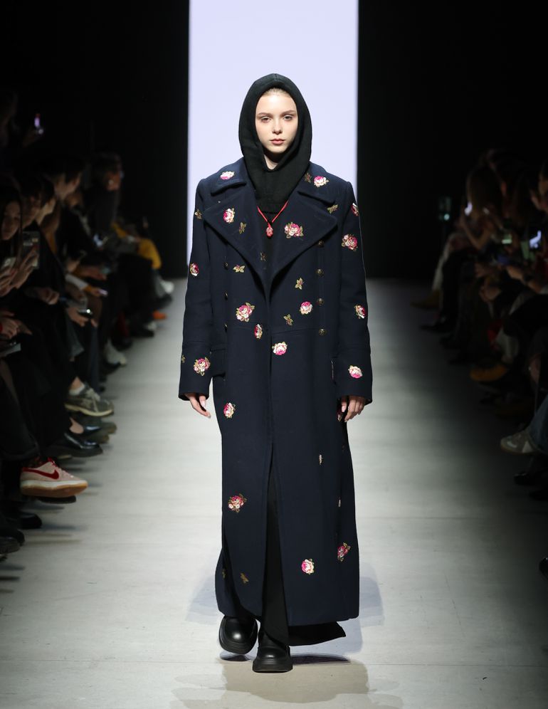 If divine intervention had a fashion equivalent, it would be the “Angels” collection by NOVIKOVA DSGN. The outerwear brand known for its machine embroidery and digital printing took inspiration from celestial beings, bringing to life coats and trench coats adorned with embroidered roses, white lilies, and artistic floral buttons. The combination of dark blue, light blue, and pastel hues created a collection that felt ethereal yet powerful.