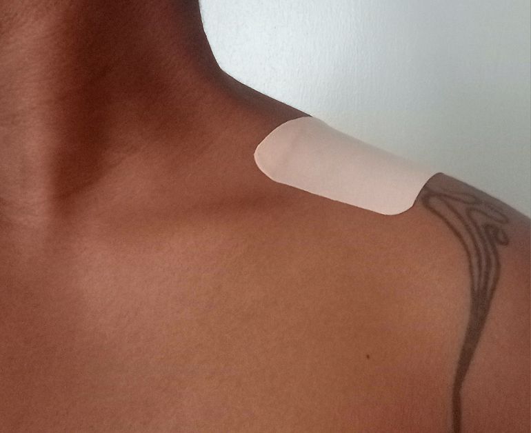 The patch stayed put under my grey t-shirt and felt unnoticeable to the touch. I even stepped out into light rain for a package pickup, and it held up, save for one edge that needed a quick smooth-down. I was impressed that three hours in, it was still securely in place and hadn’t bunched or peeled especially since my application was over the back curve of my shoulder.