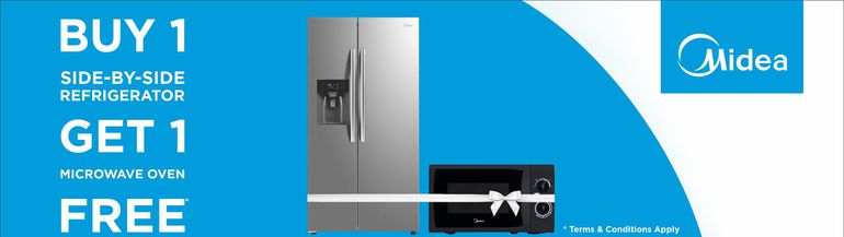 Not to mention offers like: Get a free 20 litre microwave oven when you buy a side-by-side refrigerator from Midea. Who no like better thing?
