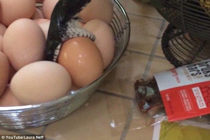 "It was a run of the mill Sunday afternoon here on our little farmette, until a noise in the kitchen made us look up... at the spice cabinet... where THIS was descending toward a basket of fresh eggs on the counter" wrote Neff online.