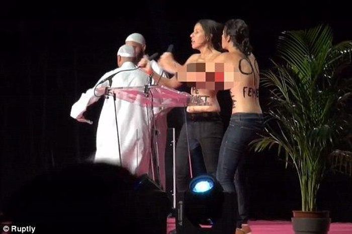 According to Inna Shevchenko, a spokeswoman for the feminist protest group, two fundamentalist preachers were discussing the question of “whether wives should be beaten or not” when the activists, aged 25 and 31, ripped off their Arab-style cloaks and jumped on to the stage on Saturday evening.