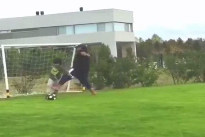 Despite being fouled by his grandfather, Benjamin continues with his run to score a goal.