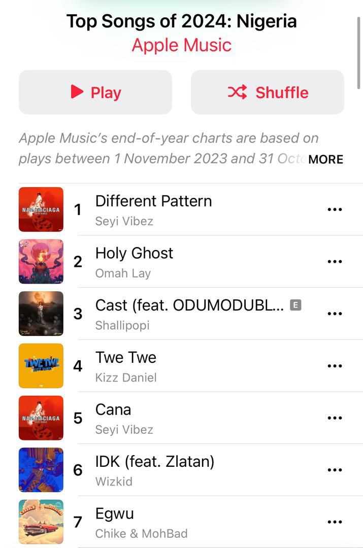 Seyi Vibez's 'Different Pattern' emerges as the most streamed song on Apple Music Nigeria in 2024.