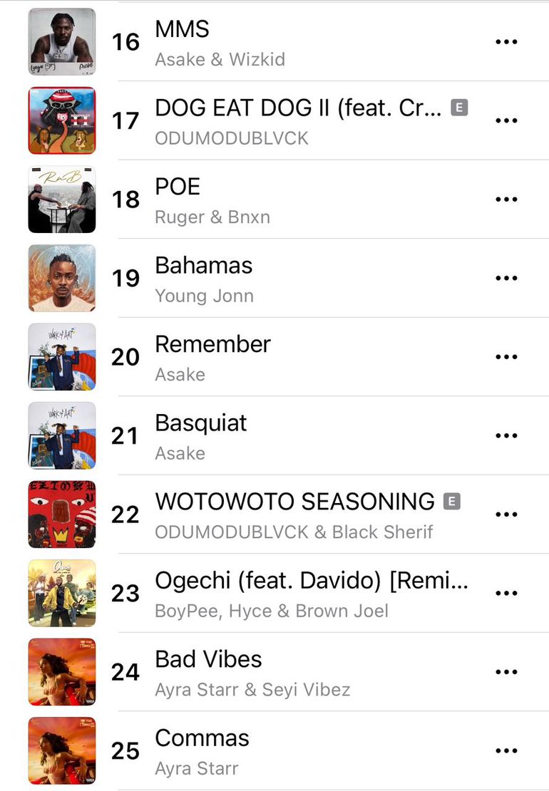 Other notable insights on the list include the absence of a female artist in the top 20, with Ayra Starr scoring the highest entry for a female act, at number 24, for her single 'Bad Vibes' featuring Seyi Vibez.