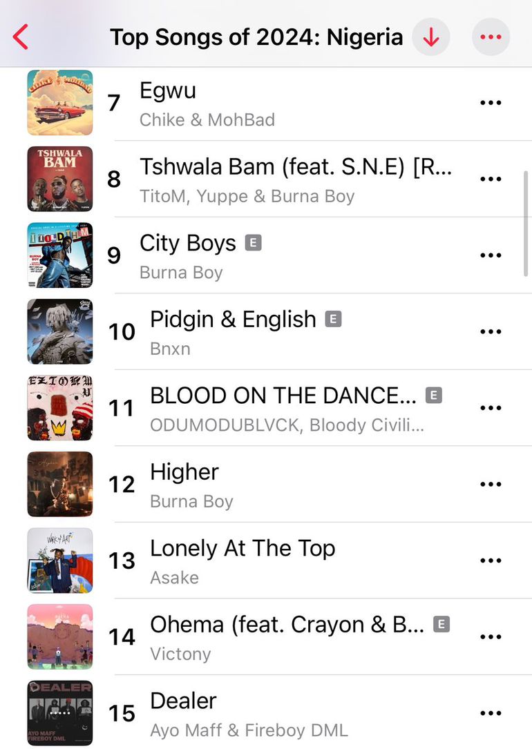 Apple Music has released its list of the most streamed songs in Nigeria in 2024 and the top 20 is dominated by songs released in 2023.
