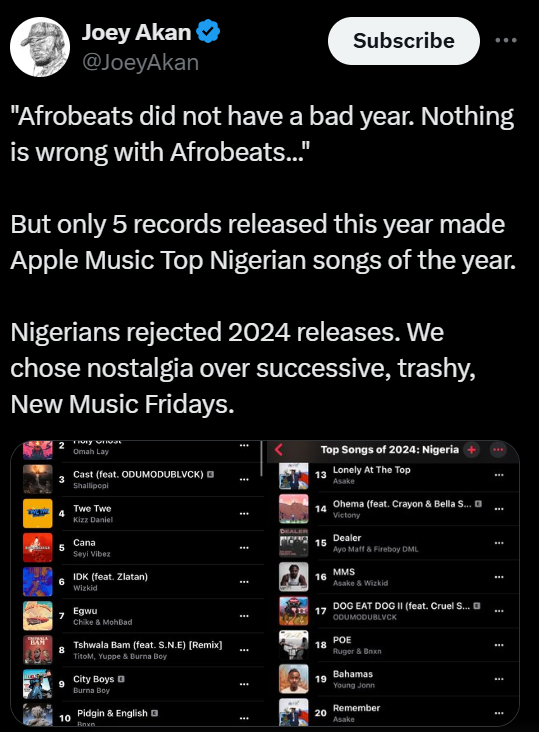 Some observers including Music Journalist Joey Akan have described the dominance of 2023 songs on the top section of the list as a reflection of the poor year 2024 has been for Nigerian music.