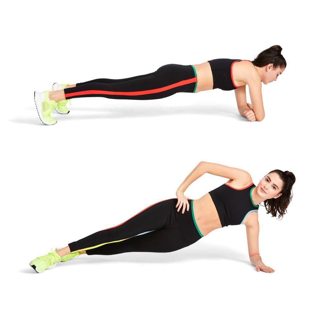 5) Screwdriver Start in forearm plank with right arm in front of left (first image) . In two counts, rotate torso right into side plank, bringing right hand to hip (second image) . Return to start in two counts. Thats 1 rep. Do 10 reps per side, resting one minute between sides. Tyler Joe