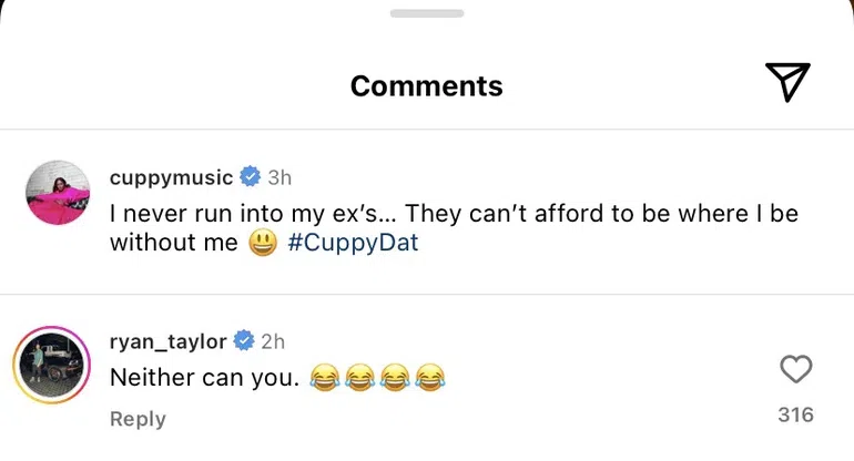 The initial social-media message from Cuppy added fuel to the fire: In a post captioned “I never run into my ex’s… They can’t afford to be where I be without me #CuppyDat”, Cuppy seemed to reference her ex indirectly.