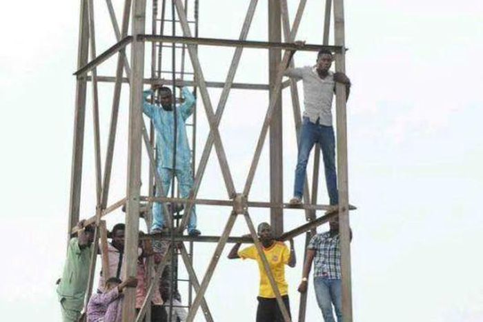 Some of the fans were seen in a photo standing and sitting on a mast while watching 3SC run riot on visiting Giwa FC on Sunday, July 12.