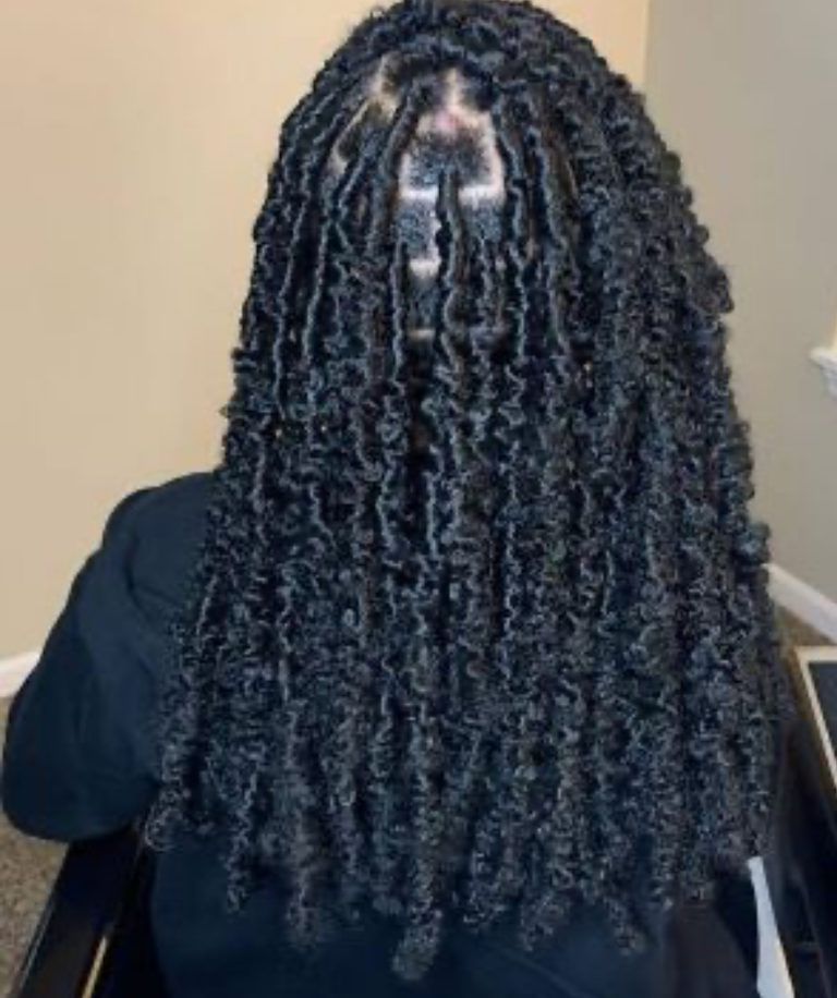 Soft, fluffy faux locs with looped ends have a “messy” natural texture to it.
