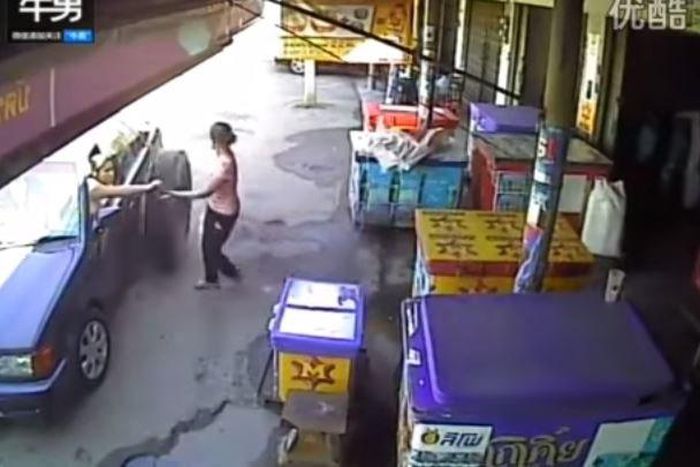 A woman was so close from being hit by a tire from a runway truck in Thailand.