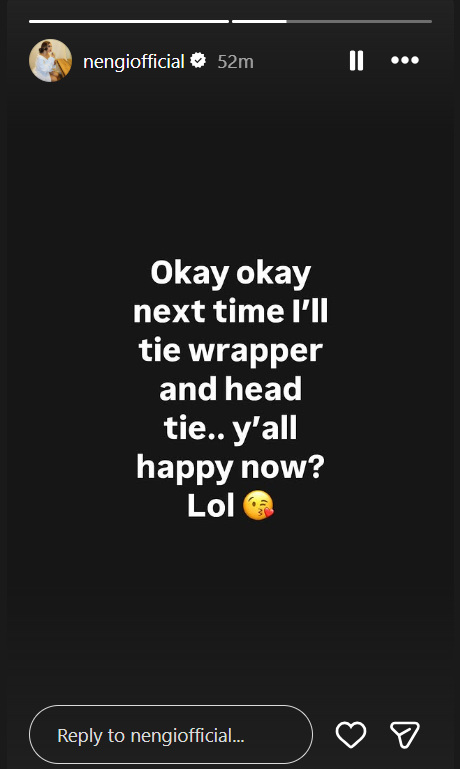 In a subsequent post, Nengi sarcastically clapped back at her critics saying, " Okay, okay. Next time I'll tie a wrapper and a head tie. Y'all happy now?"