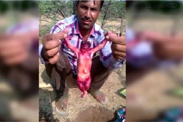 The alien-looking being is part human and reptilian with four fingers without a thumb. Some are saying it could be the fetus of an animal while others are calling it an alien. There has been no proof to determine if the creature is an extra-terrestial. There are many hoax images floating on the Internet which have sparked off rumours and superstitions.