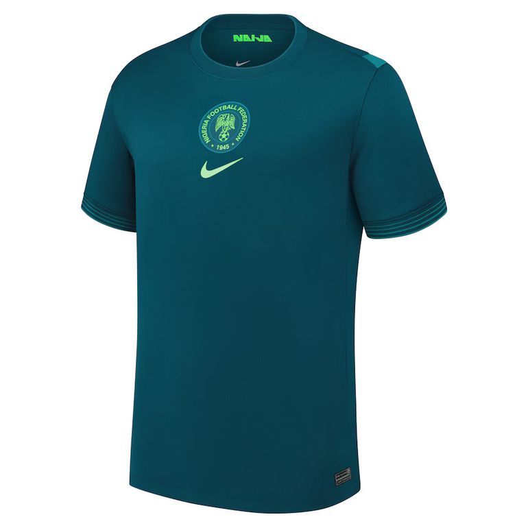 The Home kit leans into the nighttime energy of Southern Nigeria. Dark, moody, but lit with bright neon accents, it feels like Lagos nightlife bottled into fabric. Perfect for the pitch. Even better for the streets.
