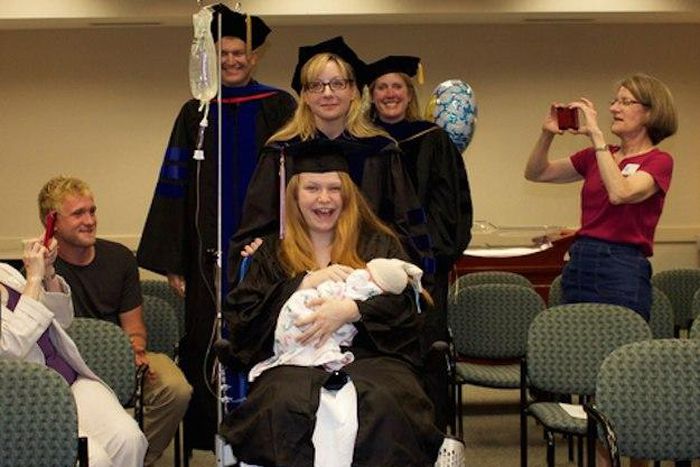 The next morning she was in no shape to travel for the ceremony. She was slightly upset that she missed her graduation, but the joy of motherhood replaced trumped that.