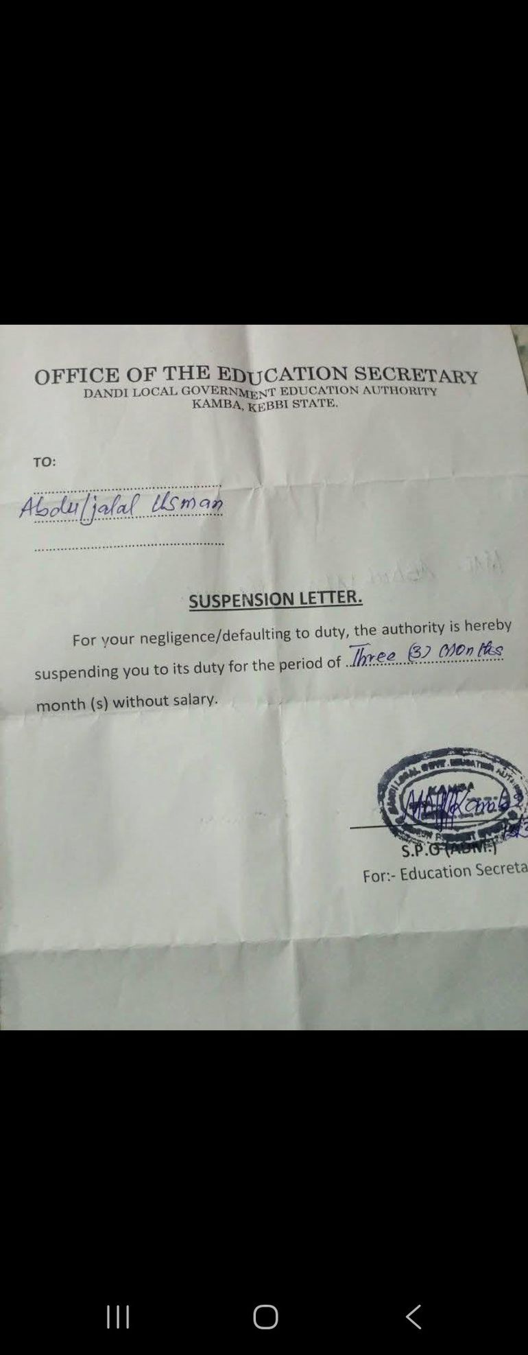 Mr. AbdulJalal Usman was handed the three-month suspension in a letter signed by the office of the Education Secretary, Dandi Local Government of Kebbi State. In the letter, the secretary accused Usman of "negligence and defaulting to duty," which attracted a three-month suspension without pay.