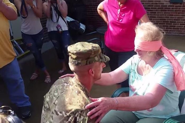 A mum who has not seen her son for two years was very emotional when he surprised her. Her son was away on military service during the whole time.