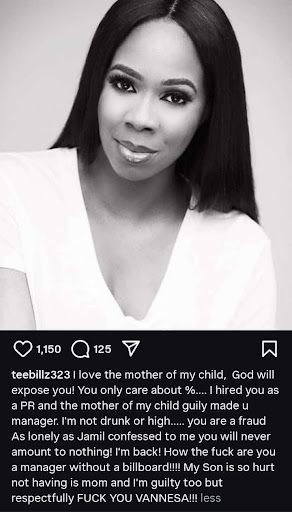 Tee Billz wrote, "I love the mother of my child, God will expose you! You only care about %. I hired you as a PR and the mother of my child, guilty, made u manager. I’m not drunk or high. You are a fraud. As lonely as Jamil confessed to me, you will never amount to nothing. I’m back! How the fuck are you a manager without a billboard! My son is so hurt not having is mom and I’m guilty too but respectfully fuck you Vanessa.”