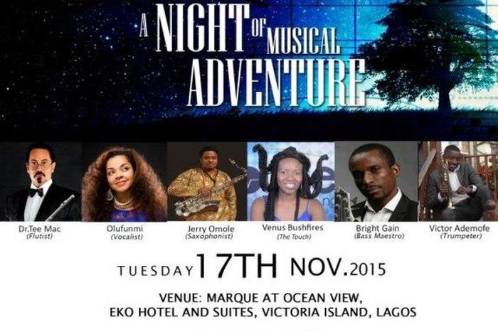 A Night Of Musical Adventure, An adventure through jazz with famous guest artistes, Tee Mac, Bright Gain, Jerry Omole, Venus Bush fires and Olufunmi taking us on an unforgettable journey of love for music and sounds.