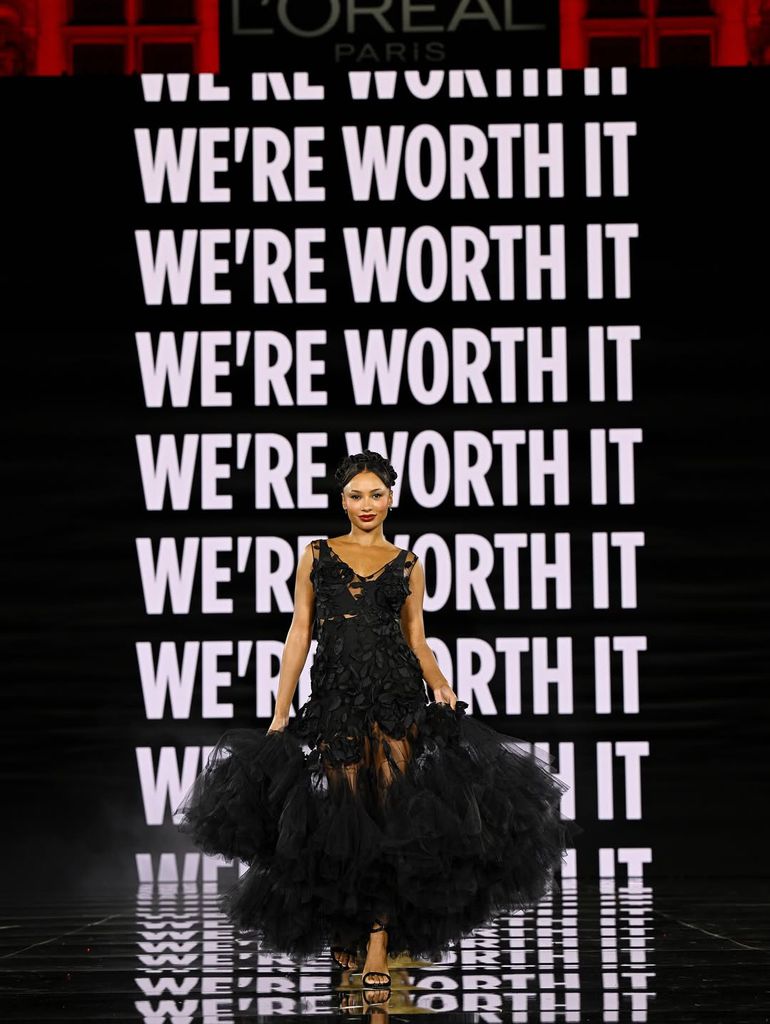 Perhaps the most powerful part of Temi’s runway moment was its backdrop: “WE’RE WORTH IT.”