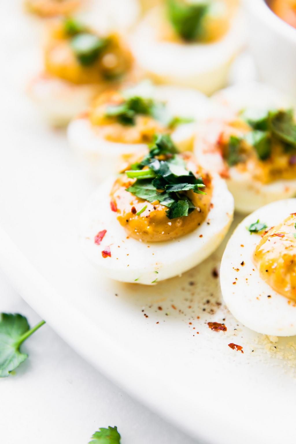 Easy Deviled Eggs With Homemade Chipotle Mayo No need to wait until your next brunch to snack on soft, creamy eggs with a touch of spice. Treat yourself any day of the week. Get the recipe Per serving: 97 calories, 7 g fat (2 g saturated), 1 g carbs, 175 mg sodium, 0 g sugar, 0 g fiber, 6 g protein Cotter Crunch