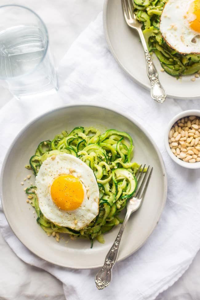 Zucchini Noodles With Everything Pesto and Fried Eggs This hearty zoodle bowl is proof that anything is breakfast-friendly when you pop an egg on top. Plus, it contains over a days worth of your recommended vitamin C intake. Take that, orange juice! Get the recipe Per serving: 554 calories, 51 g fat (7 g saturated), 20 g carbs, 399 mg sodium, 9 g sugar, 6 g fiber, 15 g protein Food Faith Fitness