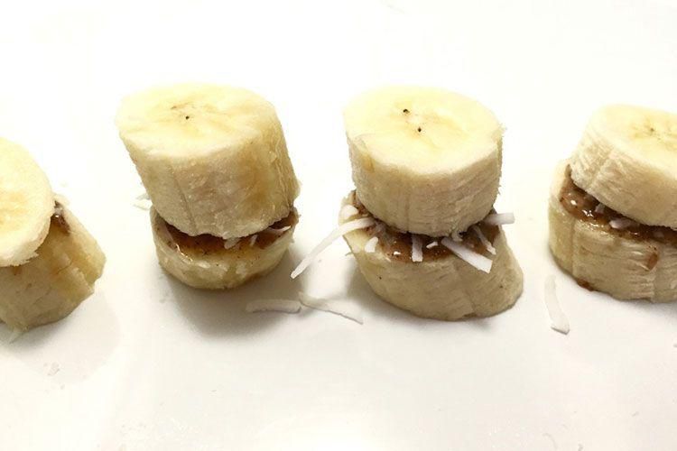 Almond Butter And Banana Sandwiches Forget breadall you need are bananas, nut butter, coconut, cinnamon, and cocoa nibs. Pop a few of these energy bombs into your mouth before you run out the door, and make some extra for that inevitable moment you hit a wall mid-afternoon. Get the recipe Per serving: 114 calories, 6 g fat (1 g saturated), 16 g carbs, 2 mg sodium, 8 g sugar, 3 g fiber, 2 g protein SkinnyMs.