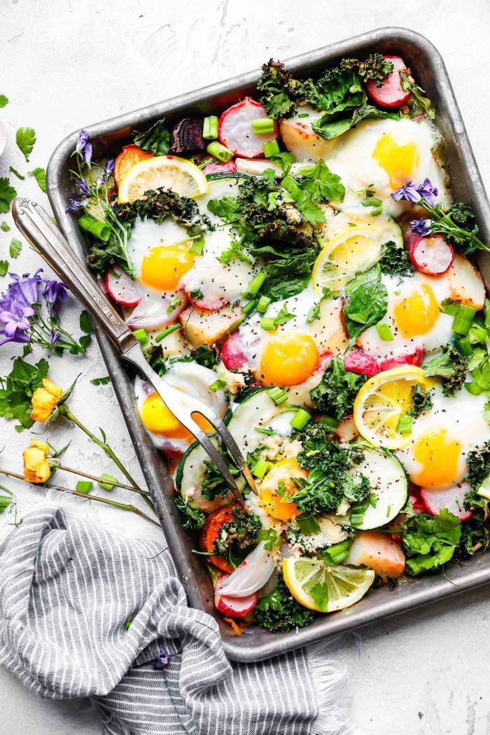 Sheet Pan Baked Eggs With Roasted Vegetables This ones kind of a dinner-y take on breakfast since youre getting a pan of vegetables youd normally pair with, say, a steak. But hey, why not start out the day with this level of convenienceand deliciousness. Get the recipe Per serving: 201 calories, 12 g fat (3 g saturated), 11 g carbs, 195 mg sodium, 4 g sugar, 2 g fiber, 12 g protein Cotter Crunch