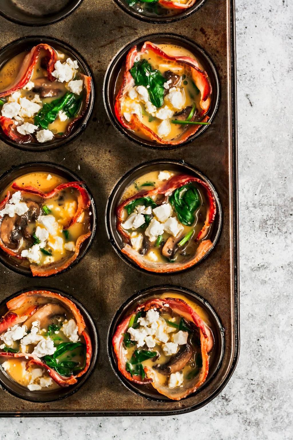 Mushroom Spinach Bacon Egg Cups Seriously, does it get any better than cups of bacon? These delectable breakfast bites are a low-carb lovers dream. Simply omit the feta cheese to make it Whole30-compliant, and youre golden. Get the recipe Per serving: 209 calories, 15 g fat (6 g saturated), 3 g carbs, 690 mg sodium, 1 g sugar, 1 g fiber, 16 g protein Ambitious Kitchen