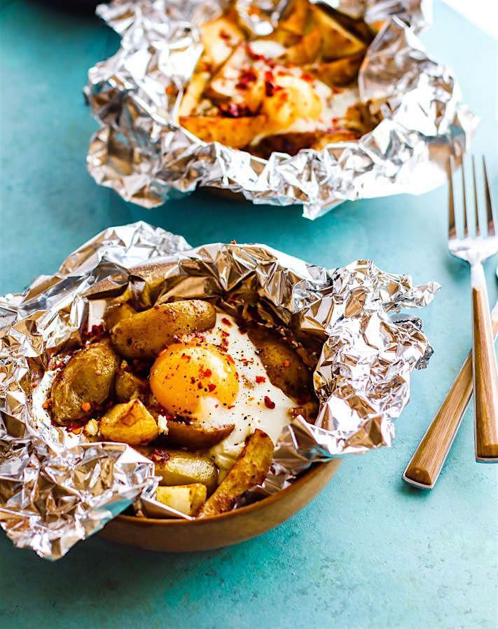 Indian Spiced Baked Potato Egg Foil Packets Thanks to flavors from curry, turmeric, and smoked paprika, this one-pan breakfast is a surprising and invigorating way to start your day. Swap golden yellow potatoes for sweet potatoes for extra vitamins. Get the recipe Per serving: 279 calories, 16 g fat (3 g saturated), 27 g carbs, 167 mg sodium, 2 g sugar, 3 g fiber, 10 g protein Cotter Crunch